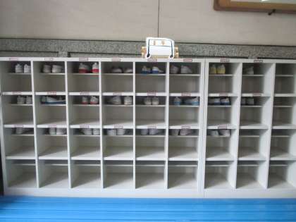 靴箱の上段に上ぐつが入っています。これはルールです。きちっとそろっていますね。みんなルールが守れているのです。