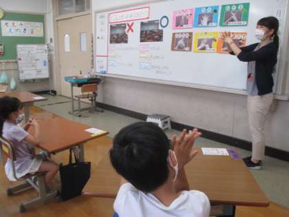 教室では友だちと距離が近くないかな?マスクはしているかな?など,自分の生活をふりかえり考えました。手洗いでは,学校で流れている手洗いの音楽に合わせて正しく手を洗うことができているのかを一人ひとりチェックしてもらいました。みんな完璧でした!