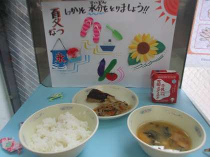 今日の給食は,ごはん,牛乳,さばのつけ焼き,切干大根の三杯酢,みょうがのみそ汁でした。さばのつけ焼きは,さばをしょうが・しょうゆ・三温糖・みりん・料理酒を混ぜ合わせたたれにつけて,スチームコンベクションオーブンを使って焼きました。皮も香ばしく焼け,とてもおいしかったです。