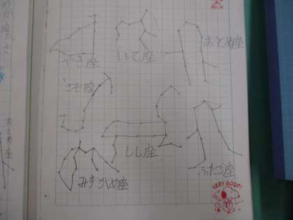 今日は理科の学習で星座趣味レーターや星座写真を用いて星について学習をしました。みんなお気に入りの星座をノートに丁寧に描いていました!