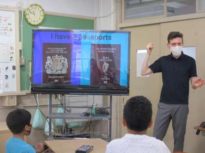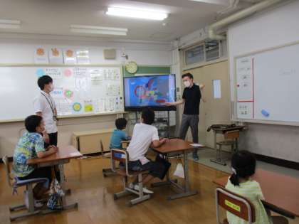 今日はALTの先生に来ていただきました!パワーポイントを見ながら,先生の自己紹介を聞いたりクイズを楽しんだりしました。英語を聞き取るのは難しかったですが,知っている英単語があると「わかった!」と言って盛り上がっていました。ALTの先生の自己紹介にみんな興味津々でした。
