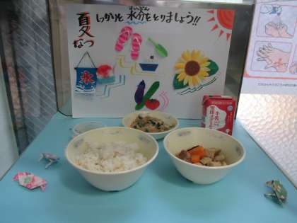 でも学校には夏がいっぱい!給食の展示食のところには,夏らしい飾りと,かにの折り紙があります。また,保健室の掲示板には,熱中症の掲示がされています。新型コロナウイルスの心配はありますが,夏は確実に来ています。