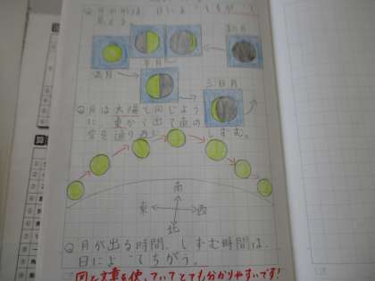 今日も自学で素敵なものがありました。月の満ち欠けについて図を用いて丁寧にまとめてありました。今日さっそく見たかったのですがあいにくの空模様...この週末にでも月は見られるかな?