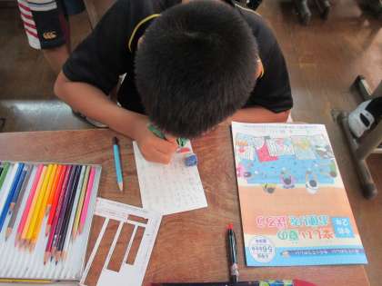 暑中見舞いをかきました。宛先は自分自身。夏休みの目標と目標実現のためにすること3つを決めて,決意表明をはがきにかきました。