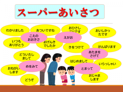 始業式でルールとマナーの話をしました。マナー特にをがんばってほしいと思います。あいさつでは,スーパーあいさつをがんばってほしいです。「おはようございます」の後に付け加えて「いいお天気ですね」や「ありがとう」と言われた後に付け加えて「どういたしまして」などです。これは意識しないとできません。また,「声の大きさ」「笑顔で」「目を見て」「止まって」「頭を下げて」もスーパーあいさつのポイントです。下校の時には,早速実行してくれる子どもたちがたくさんいて,驚きました。スーパーあいさつ名人がいっぱいです。