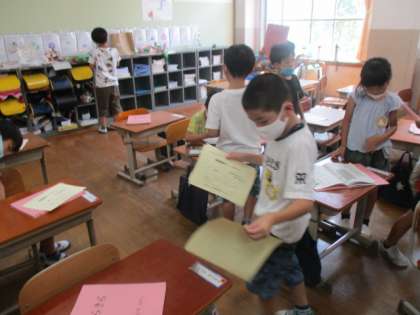 帰りの会の前,いつも先生の前に一列に並んで,宿題の配りのお手伝いをしてくれます。みんなで協力できるのは素敵なことですね。