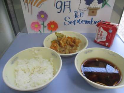 9月2日(水)今日の給食は,ごはん,牛乳,夏野菜のかきあげ,かみなりこんにゃく,赤だしでした。夏野菜のかきあげには,ゴーヤやかぼちゃなどの夏においしい野菜が使われています。「かぼちゃのあまみとゴーヤのにがみがおいしかった!」と言ってくれる人がたくさんいました。3年生の教室にも,「ゴーヤはにがいから,きらい・・・」と言っていた人が,おかわりしている姿を見ました。すてきですね。