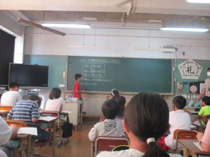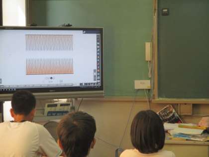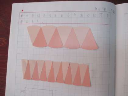 円を切って並び替えると,平行四辺形に。デジタル教材では,もっと細かい並び替えを動画でみることができ,長方形に近くなる様子がよくわかりました。これらの結果から円の面積の公式を作り出すことができました。これからもデジタル教材を効果的に使って理解につなげていきたいと思います。