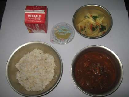 今日の給食は,麦ごはん・牛乳・ハッシュドビーフ・じゃがいものソティ・りんごゼリーでした。ハッシュドビーフは,ごはんにかけて食べるので食べやすかったです。いつもより時間も早く食べる事ができました。暑いとき,冷たいデザートはうれしいです。