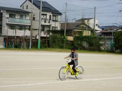 運動場にかかれた道路を,教わったきまりをまもって走ったり,ジグザグコースや一本道を走ったりしました。