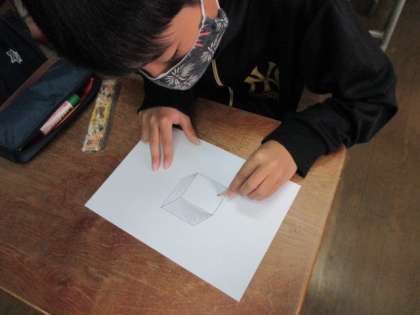 右上から光が当たっているように描くには,どのように陰影をつければ良いのでしょうか。光の角度を考え,濃度を変えながら,丁寧に描いていました。