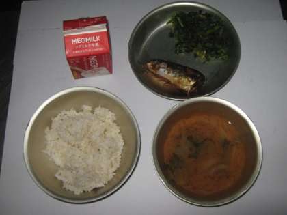 みそ汁でした。今日はスマイル給食で,全校が10グループに分かれての縦割り給食でした。さんまは骨がとりやすく,食べやすかったです。暑い時でも温かいみそ汁は人気があります。