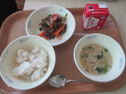 今日の給食のメニューは,ごはん,牛乳,プルコギ,レタスと卵のスープでした。子どもに人気のメニューです。