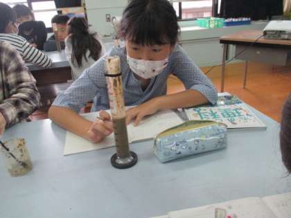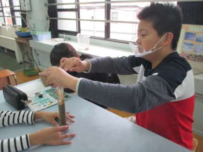 メスシリンダーに,土砂に見立てたどろや砂を流し込み,たい積する様子を観察しました。地層のようにしま模様ができるはず,という子どもたちの予想ですが,うまくできるでしょうか。