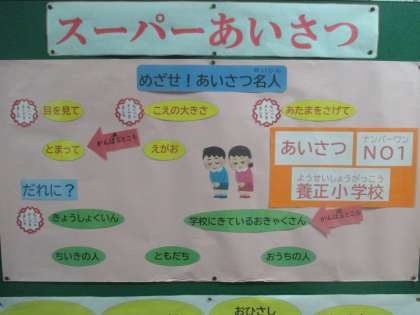 養正小学校では,スーパーあいさつをがんばっています。とってもすてきなあいさつができる子どもたちですが,今がんばっているのは,止まってあいさつをすることです。あと,教職員にはあいさつはできるようになったのですが,学校に来られているお客さんには,まだできているとは言えません。