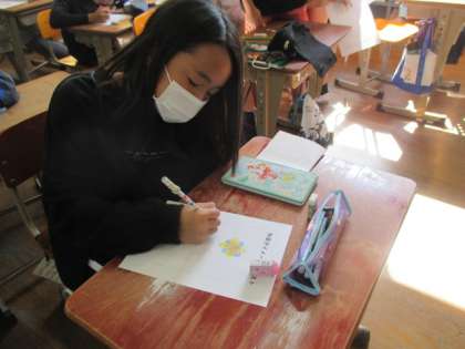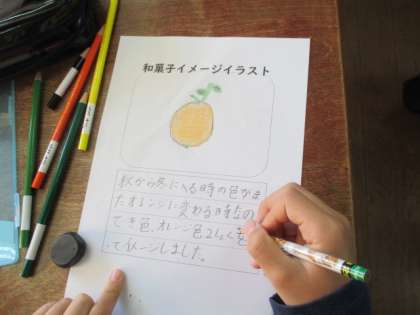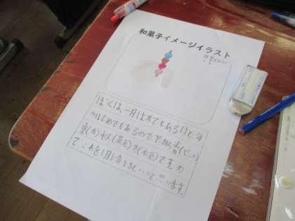自分たちで販売する和菓子のデザインを一人ひとり考えました。職人さんに教えていただいたように,形や色に意味や思いをこめ,季節を感じられるものを考えました。
