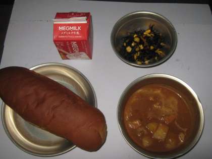 今日の給食は,黒糖コッペパン・牛乳・チキンカレーシチュー・ひじきのソティでした。カレーのピリ辛が,暑い時食欲をそそります。子どもたちもよく食べていました。