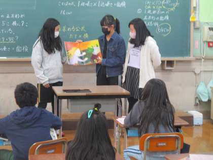 いまは毎週水曜日は昼休みと掃除の間に読書タイムがあります。今日の読書タイムは,図書委員がよみきかせに来てくれました!