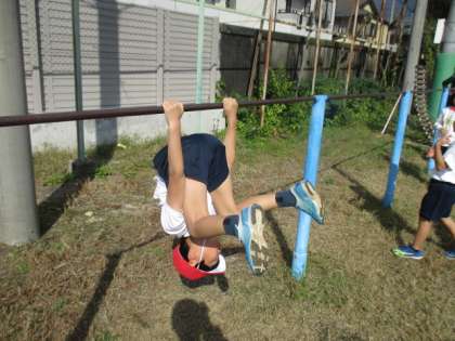 鉄棒では,「こうもり」「地球まわり」「前回り下り」などさまざまな技に挑戦しています。友達の技も見ながら,できるようになるためにたくさん練習しています。