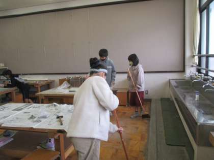 新聞紙を広げて作業をしたものの,やはり床にはたくさんの石の欠片が。その欠片を,休み時間にも関わらず,たくさんの6年生が自主的に掃除している姿がすてきでした。