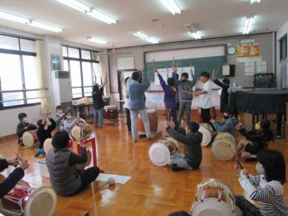 音楽室での練習の様子です。和太鼓とチャンゴが合わさり,迫力満点です。