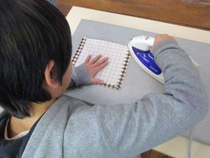家庭科で巾着づくりをしています。アイロンで布に折り目をつけたり,端を手縫いしたり…。出来上がりが楽しみです。