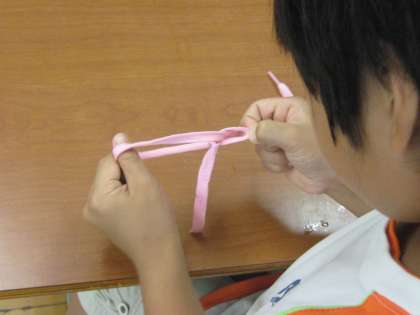 ひもの結び目をほどいたり,ちょうちょう結びをしたりしました。