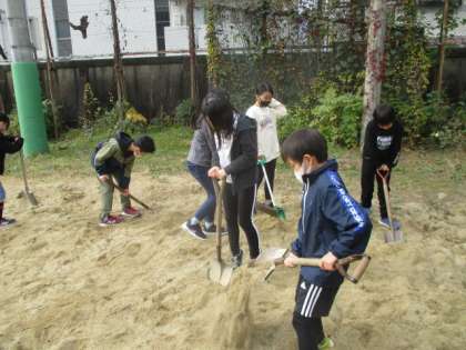 体育科の学習で走り幅跳びをしています。着地の時に足腰に負担が少なくなるように砂場を掃除時間に柔らかくしてもらっています。休むことなく柔らかくする姿はとっても素敵です。