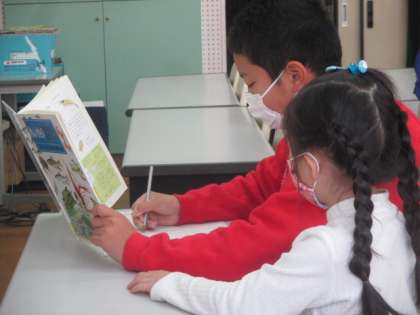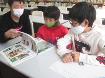 ドリームワールドにある観察池にメダカやエビを入れて,生きもののいる環境をつくりたいという案が子どもたちから出てきたので,エサは必要なのかやどのようなすみかにするのがいいのかなどを図鑑で調べました。メダカグループ・エビグループに分かれて,必要な情報を集めました。