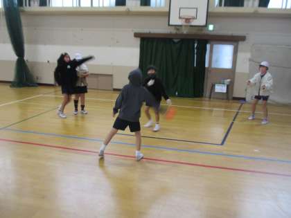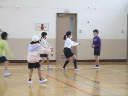 3学期初めの体育はタグラグビーの学習です。使い慣れない楕円形のボールを使っての学習になるので今日は,まずは楕円形のボールを使ってパス回しなどをしました!