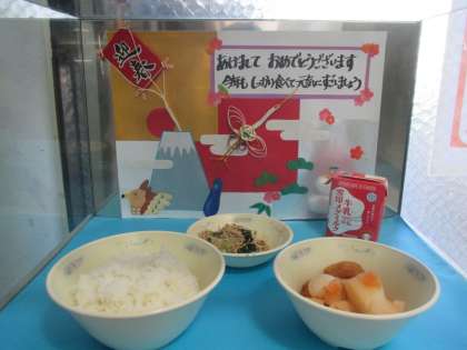 今日から給食が始まりました。今日のメニューは,ごはん,牛乳,関東煮,もやしと小松菜のごまいためです。給食室から出汁のいいにおいがしてきます。