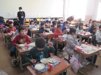 給食時間に1年生の教室に行きました。前を向いて静かに給食を食べる子どもたち。「給食楽しみやった」「わたしも待ってた」「おいしいから給食好き」などの声が聞こえてきます。「校長先生も楽しみやってん。給食はいいなぁ。」と答える校長先生。