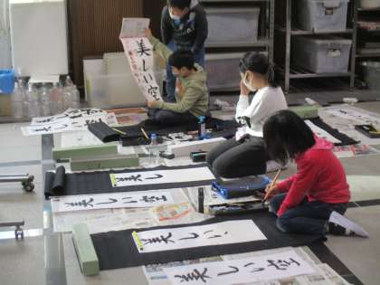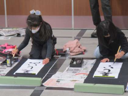 今日は書写の時間に書き初めをしました。いつもの半紙とは違う画仙紙に「美しい空」という字を書きました。今日の作品は,18日からの書初め展で展示する予定です。
