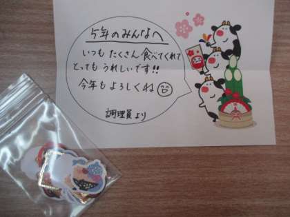 今日はなごみ献立。給食を取りに行くと,封筒が…。中には給食調理員さんからのお手紙とプレゼントのシールが入っていました。毎日しっかりと食べていることをほめてもらいました。今年もありがたく,おいしく給食をいただきます。