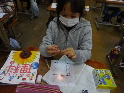 かん電池,豆電球,どう線つきソケットを使って,明かりをつけよう!