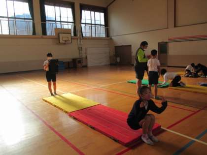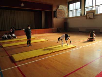 マット運動の学習では,自分の動きを知るためにタブレットを使っています。友だちに動画を撮影してもらい,直後に自分でチェックすることができます。動画をみて,どこをどう直せばよいのか考え,気を付けるポイントを見つけて次の練習につなげることができています。