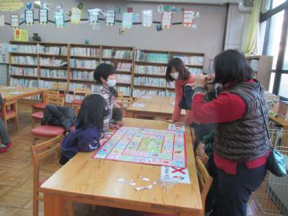 1月のぶっくままクラブは読み聞かせとすごろくをして楽しみました。大きな声をださないという注意を守って楽しんだ子どもたちです。