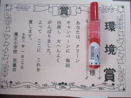 前回までのクリーンキャンペーンが皆勤の人に児童会から賞状が贈られました。その数なんと40名以上。いつもありがとうございます。これからも友だちを誘ってきてくださいね。