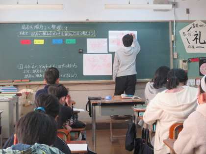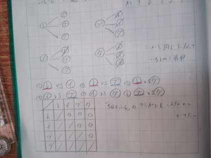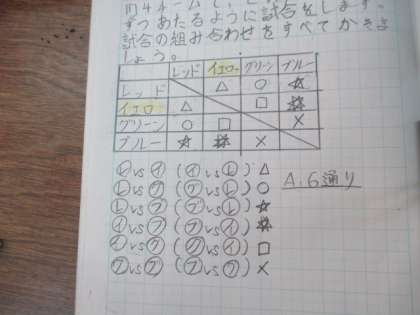 レッド・ブルー・イエロー・グリーンの4チームが対戦します。試合の組み合わせ方は何通りあるでしょう?という問題です。自分なりの表や図に整理して,答えを見つけることができていました。またその後の発表場面では,自分とは違う方法の意見をしっかりと理解しようと,友だちの話に耳を傾ける姿もすてきでした。