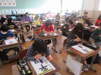 今日の書写の学習では,「平和」という言葉に取り組みました。今までの学習で習ってきたポイントを押さえながら全体のバランスを意識して書きました。