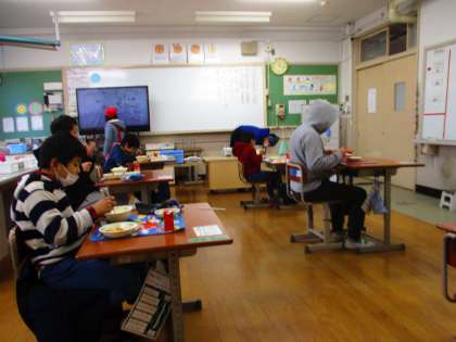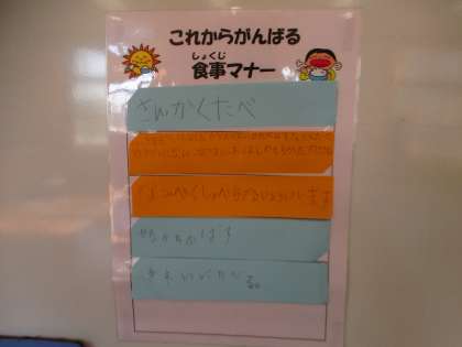 授業で,えのき学級のみなさんと「食事マナー」についてかんがえました。食事マナーをより良くしていくためにどんなことができるかを話し合うことができました。また,これからがんばりたい目標を一つ決め,それをいしきしながら一週間給食時間をすごすことができました。えのきのみなさんは,せすじがピンっとのび,とてもステキでした。ここに写真をのせて,全校のみなさんにじまんしたいと思います。