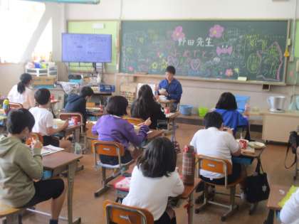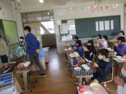 今週は給食週間です。交流給食ということで他クラスの先生に4年教室に来てもらって一緒に給食を食べました。子どもたちは以前担任をしてもらっていた先生ということもあり,大歓迎でした。