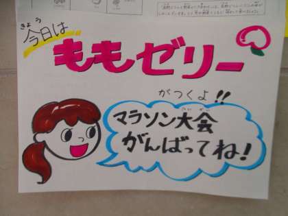 今日は,マラソン大会でした。どの学年もいっしょうけんめいがんばりました。手をぬいている人は,一人もいませんでした。とってもとってもステキでした。今日は,そんなみなさんに,給食室からももゼリーのごほうびがありました!ひんやり,おいしかったですね。