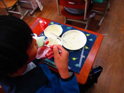 3月3日,今日はひなまつりでした。給食室前のろうかには,花ちょうちんがかざられています。とてもかわいらしいですね!今日の給食は,ちらしずし,牛乳,さばそぼろ,三つ葉のすまし汁,三色ゼリーでした。今日の給食クイズは,三色ゼリーの色についてでしたね。「桃色」「白色」「緑色」は,まだ雪の残る3月にきれいにさく桃の花と草を表しています。子どもたちは,ひんやりとあまい三色ゼリーを「ひ〜!つめたいけどおいしい〜。」と言いながら食べていました。養正小学校の子どもたちが,これからも健康で幸せでありますように★