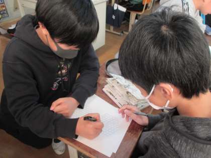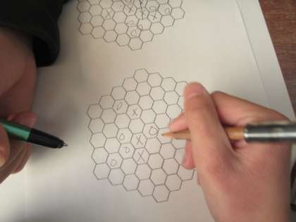6年生がはまっているパズル。ハチの巣の形をしたマスに交代で印をつけていきます。4マス直線にそろえば勝ちですが,3マスそろうと負けです。つまり,2マスと1マスの間に最後の印を入れなければいけません。頭を使います。雨の日の絶好の遊びになっています。