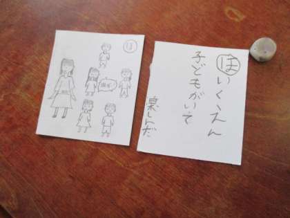6年間の思い出をテーマにかるたをつくりました。写真のかるたは,5年生の時に保育所で保育士体験をしたときのものですね。たくさんの思い出がよみがえります。