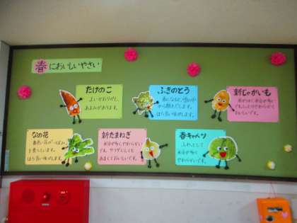 3月の掲示板のテーマは,「春においしいやさい」です。スーパーにも「春」を感じられる野菜がならびはじめましたね。ひぐち先生の家の近くには竹の子がたくさん生えています。見るたびに,のびのびのびていきます。気が付くと,立派な竹になっています。養正小学校の子どもたちも,毎日成長していくすがたを見せてくれます。先生がみなさんから元気をもらっている毎日です。