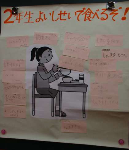 2年生のみなさんと,食に関する授業をおこないました。今回のめあては,「よいしせいで食べよう」でした。よいしせいで食事することは,見た目がかっこいいだけでなく,体にもいいことがたくさんあると知って,自分の食事中のしせいをふりかえることができました!この日も,いぶくろがつぶれないように,背中をピンとのばし食べているすがたがとてもステキでしたよ。