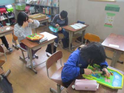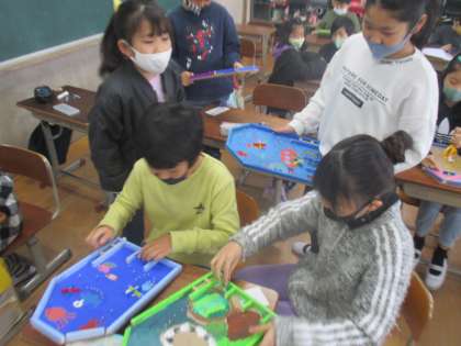 今日は先日図工展でも飾っていたコロコロガーレの作品を楽しみました。釘の微調整など最終の仕上を行っていた子どももいました。