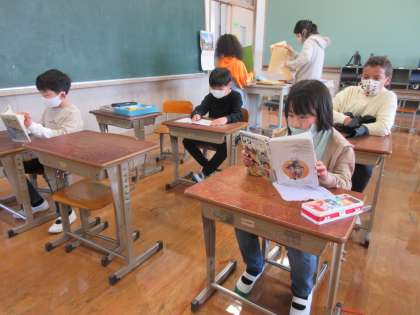 新しい教室に配架されている本に子ども達は興味津々でした。